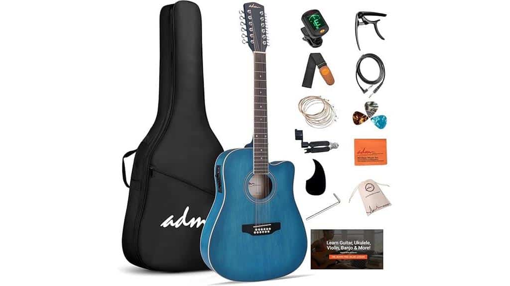 The ADM 12 String Guitar stands as a tribute to the harmonious blend of craftsmanship and aspiring artistry—its premium basswood construction and 12-string configuration create a tone that resonates deeply. With a cutaway body designed for seamless access to higher frets, it invites exploration, much like the journey of personal growth. The built-in tuner and 4-band EQ offer tailored sound adjustments, reminding us that, akin to music, life requires fine-tuning. What lies ahead in this exploration?