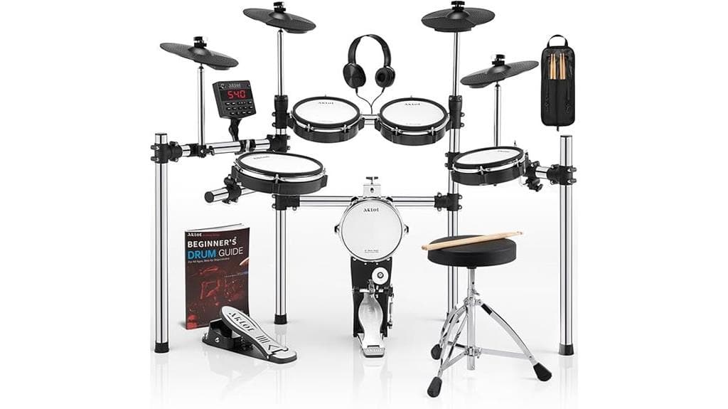 Three 8-inch toms enhance tonal variety, while the cymbals’ choke function encourages thoughtful creativity. Each feature nurtures not just skill, but the spirit of collaboration and sharing. Additionally, the AKLOT Electric Drum Set is designed to elevate your music game, making it an excellent choice for aspiring musicians.