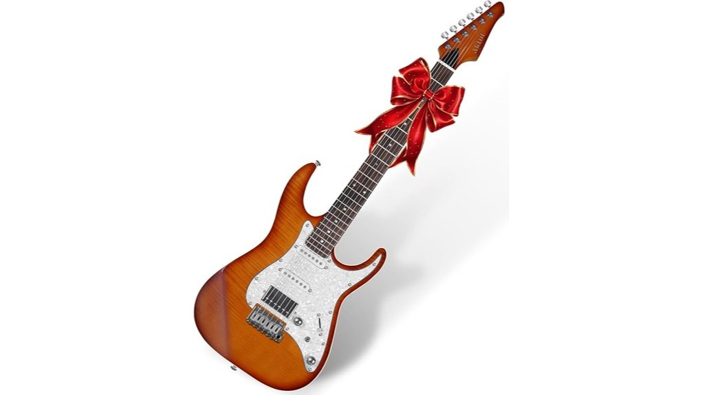 The AKLOT Veltrix sings with a roasted maple neck—dense, stable, seasoned by time and heat, much like character forged in quiet trials. Its okoume body breathes with resonance, alive beneath a flame maple crown that mirrors the beauty hidden in disciplined pursuit, a reminder that strength and elegance often grow from the same root. HSS Alnico 5 pickups deliver clarity and fire, each note a balance between control and passion—much like faith in motion.