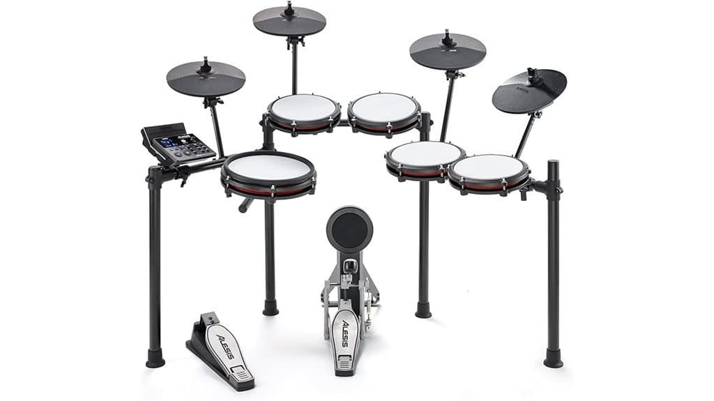 The Alesis Nitro Max Kit stands as a proof of modern drumming technology, featuring quiet mesh pads that absorb sound—much like life’s challenges that invite introspection. With over 440 sounds at one’s fingertips, it offers a sonic palette for creative expression, akin to the diverse experiences that shape our spiritual journeys. This compact kit, designed for small spaces, invites drummers to embrace their passion, echoing the call to cultivate one’s gifts. What lies beyond its specifications may surprise those who seek deeper connection.