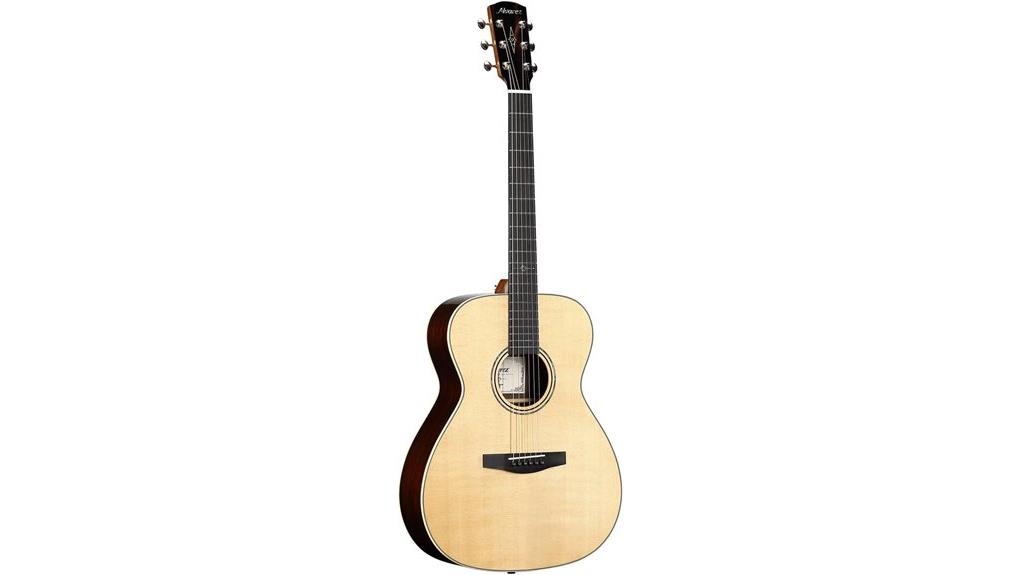 The Alvarez LF70e Laureate features a solid Sitka Spruce top, producing sonic clarity akin to a refined spirit, while the East Indian Rosewood back offers a foundation of deep, resonant warmth.