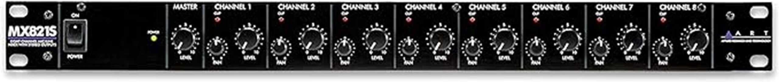 • The ART MX821S mixer features eight independent input channels with both balanced XLR and unbalanced 1/4-inch TS connections for versatile audio input options.