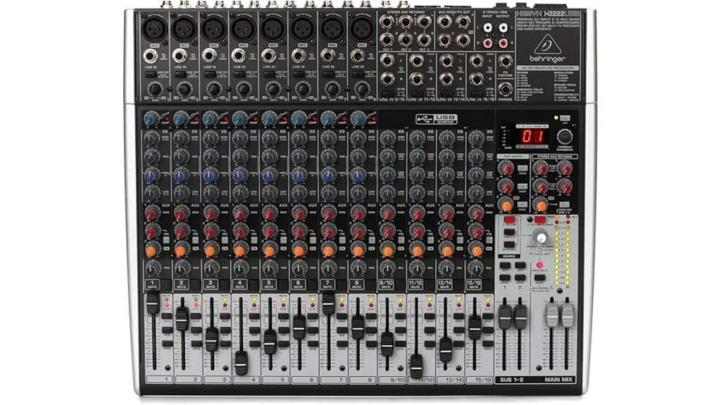 You might think that a mixer with 22 channels is overwhelming, but the Behringer Xenyx X2222USB simplifies complexity into harmony. With its high-quality XENYX mic preamps and warm British EQs—akin to nurturing the soul through music—this mixer invites you to explore your creative potential. Each studio-grade FX processor preset serves as a reminder that, like life’s varied experiences, sound can inspire growth. Let’s uncover how this remarkable tool can elevate your audio journey.