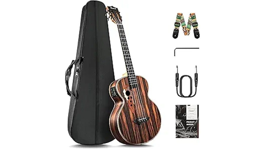 Though rooted in meticulous craftsmanship, the Caramel Ebony Wood Baritone Ukulele ascends beyond mere instrument – its striped ebony body, hand-polished to a silken luster, carries the quiet dignity of a tree shaped by time and tide, akin to a steadfast spirit refined through patience. The inlaid binding, precise and smooth, guides fingers with grace, a reminder that strength and beauty coexist in service. Its 30-inch frame, balanced and ergonomic, invites long hours of playing, ideal for those who teach, heal, or soothe through music. Each detail – from edge contour to wood grain – whispers of intention, a vessel not only to make sound, but to foster connection, one note at a time. best electric guitars are often praised for their precision and tonal versatility, though this ukulele stands apart in its acoustic authenticity. Epiphone’s most acclaimed models include the best epiphone electric guitars, known for their build quality and rich tone.