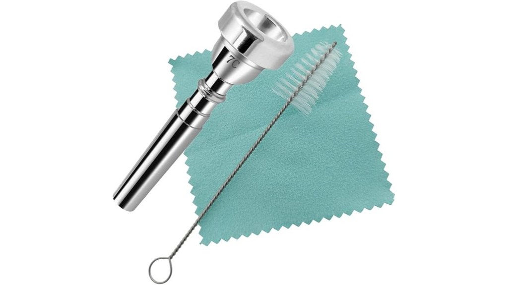 The CashBeat 7C Trumpet Mouthpiece Set is a silver-plated brass mouthpiece designed to enhance sound quality and comfort for musicians of all skill levels. It includes a cleaning brush and polishing cloth for easy maintenance, promoting durability and playability.