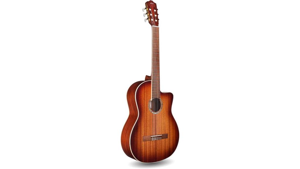 Ergonomic grace, embodied in the soft cutaway design, allows the hand to rise into the upper registers as if ascending a gentle hillside, fingers meeting notes with ease where tradition often demands struggle – a reminder that accessibility in art, like compassion in life, removes unnecessary barriers to expression. The slightly thinner mahogany neck, crowned with a 50mm nut width, welcomes smaller hands and hesitant fingertips, akin to an open door at the start of a long journey. Pau Ferro fretboard and bridge offer smooth passage, their warmth tempering effort – a quiet lesson in humility, service, and the strength found in gentle design. While this nylon-string classical guitar excels in comfort and tonal refinement, those seeking steel-string electric performance might consider best electric guitars for beginners for amplified versatility and genre flexibility.