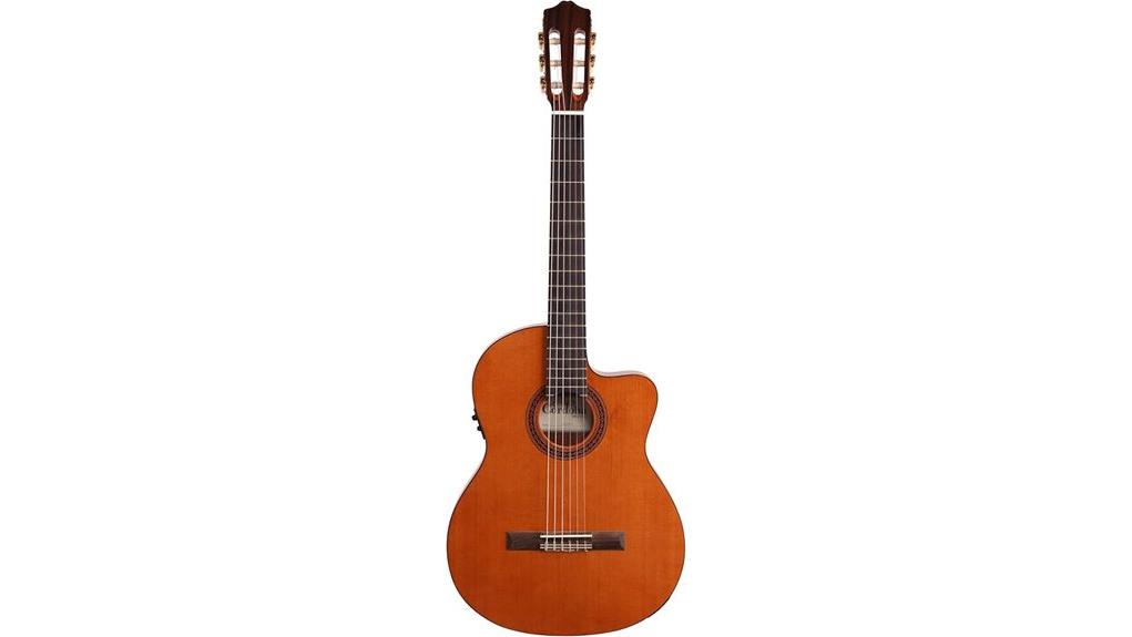 The Cordoba C5-CET CD combines a solid Canadian cedar top with a thinline cutaway body, offering ergonomic comfort for the weary traveler, akin to a spiritual vessel designed for the journey rather than the sanctuary.