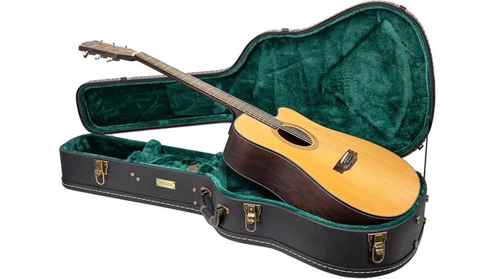 The molded interior dimensions, a body length of 21.25 inches and a lower bout of 16.1 inches, cradle the instrument securely, akin to a steadfast community supporting a neighbor’s journey. Unlike other options, finding the best acoustic guitars for beginners is easier when manufacturers prioritize such protective details. This thoughtful accommodation extends to the Taylor Grand Auditorium, allowing musicians to safeguard their calling against the world’s friction, a reminder that even the most rigid structures serve to nurture delicate spiritual growth. These features distinguish the case from lesser quality options often found in the market.