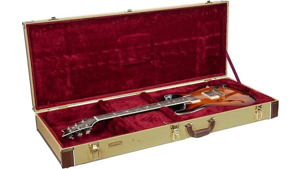 - The case features a durable multi-ply wood frame with a Vinyl Tweed exterior for reliable protection during travel. An ergonomically designed carrying handle and internal accessory compartment ensure comfortable transport and organized storage.