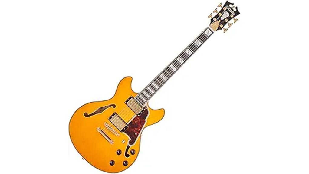 Equipped with USA Seymour Duncan ’59 Model mini humbuckers, the guitar delivers a warm, punchy vintage timbre with focused clarity. The Ebony top ensures clear note articulation, while the semi-hollow construction adds robust sustain and acoustic resonance to your tone. This premium instrument contrasts with beginner models by offering specialized electronics and a lightweight design for prolonged endurance.