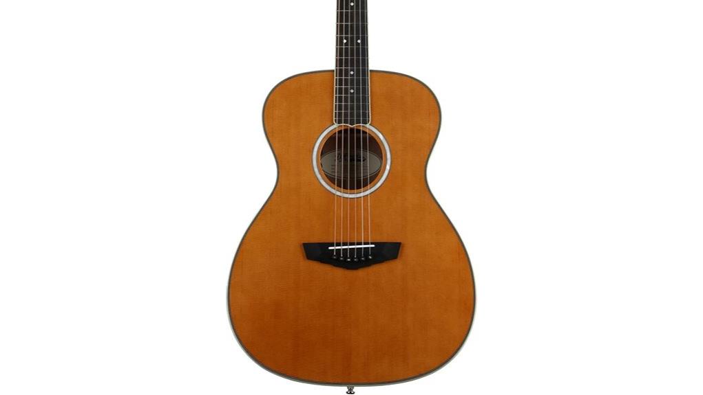 It features a vintage natural finish, however, the specifications do not mention a pickguard. The instrument boasts a solid Sitka spruce top, mahogany back and sides, and an ebony fretboard.