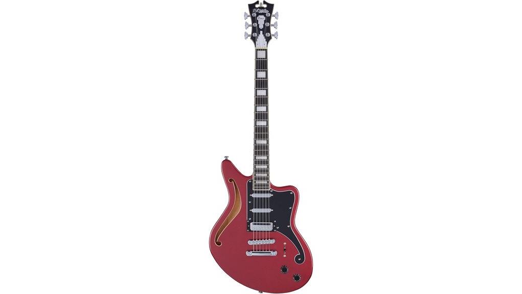 The semi-hollow maple body and oversized chamber produce complex resonance and full-bodied tone, distinguishing it from standard solid-body guitars.