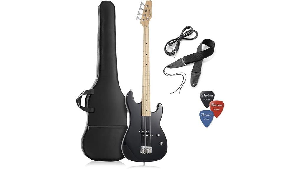 - This full-scale bass features a solid basswood body and maple neck, offering beginner-friendly stability and playability at an affordable price.