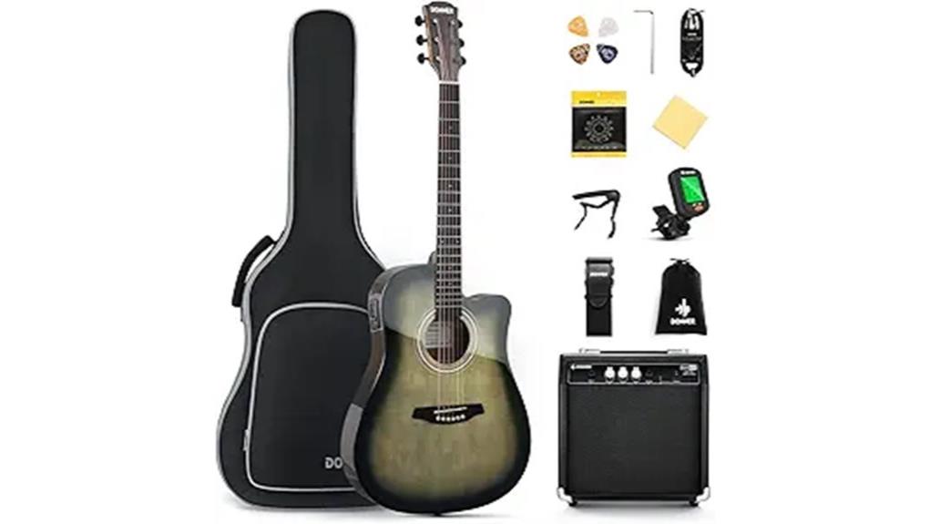 - The full-size kit includes essential accessories like a digital tuner, capo, extra strings, and a ten-foot cable for immediate playability.