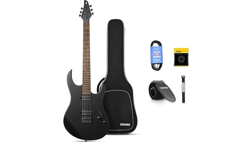 Crafted with intention, the Donner DMT-100 emerges from a union of resilient solid poplar body and a seasoned maple C-shape neck, grounded in structural integrity and refined through time—each component shaped by deliberate craftsmanship, much like the steady cultivation of discipline in quiet practice. The Indian laurel fretboard, smooth underhand, supports 24 copper-nickel frets—precisely aligned, enabling clarity in rapid passage, akin to truth spoken with gentleness and accuracy. A string-thru fixed bridge anchors tone with stability, a reminder that strength often lies beneath the surface. Polished through 30 stages, the curved body wears its matte finish humbly—resistant, unflinching, ready to serve, not to be seen. For those exploring affordable options, the best electric guitars for beginners offer similar features at competitive price points.