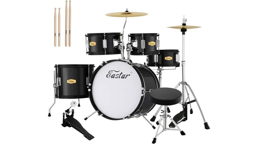 The Eastar 16-inch 5-pieces Drum Set EDS-350MBK stands as a demonstration of the harmonious blend of craftsmanship and educational potential—constructed from durable cross-grained poplar, it not only enhances sound quality but also fosters resilience in young musicians. This five-piece arrangement, akin to the components of a well-orchestrated team, encourages collaboration and growth. With adjustable thrones and essential accessories included, it serves as a reminder that proper posture and practice pave the way to mastery. Yet, what deeper lessons lie within this musical journey?