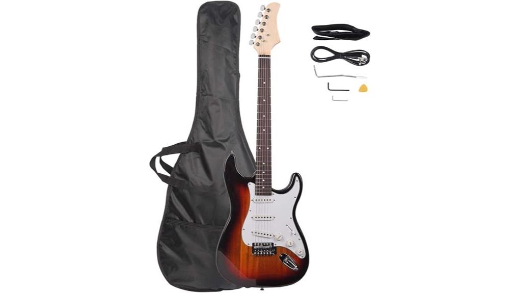 - Includes essential accessories like a protective gig bag, capo, tremolo arm, and cable for immediate playability.