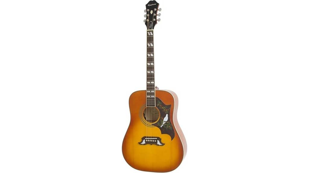 The Epiphone Dove Studio Guitar stands as a tribute to both craftsmanship and innovation, embodying a harmonious blend of art and engineering that’s reminiscent of a well-tuned symphony—one that resonates deeply with the soul.