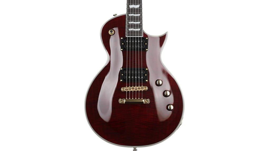The ESP LTD Deluxe EC-1000T CTM merges resonant chambered mahogany with a thick flamed maple top, a union of earthy warmth and brilliant clarity, akin to the soul’s need for both depth and light.