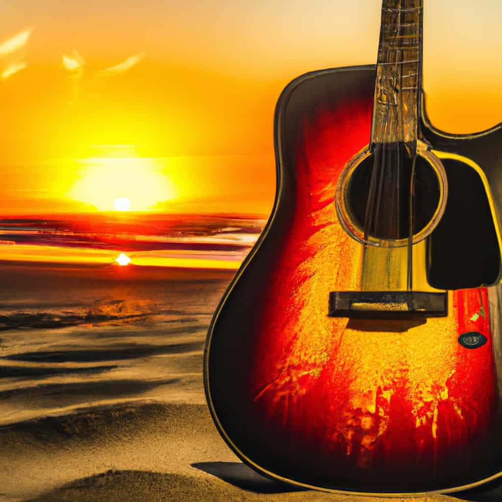 An image showcasing the Fender Malibu Player Acoustic Guitar against a backdrop of serene beach scenery, with its sleek mahogany construction and vibrant sunburst finish shining under the golden rays of the setting sun
