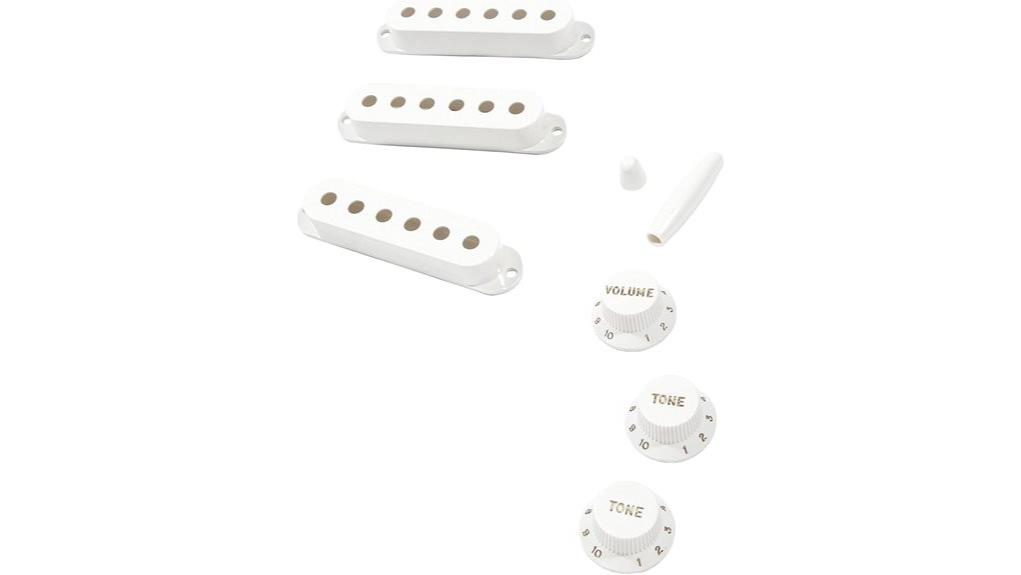 - The kit contains five eggshell-finished plastic components: volume and tone knobs, pickup covers, and switch and tremolo tips.