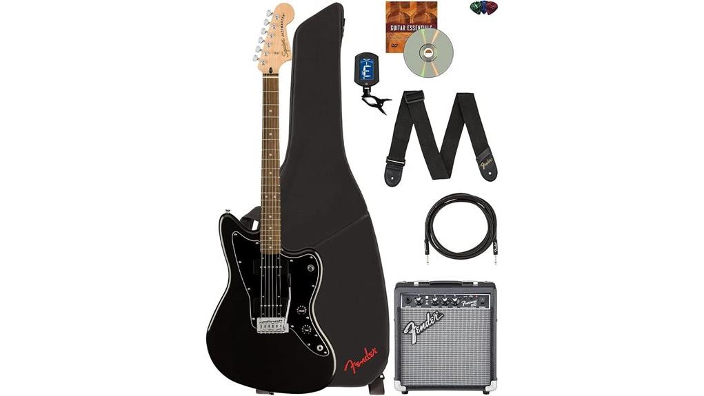 - The Squier Affinity Jazzmaster bundle includes a gig bag, amp, tuner, strap, picks, cable, cloth, and instructional DVD for beginners.
