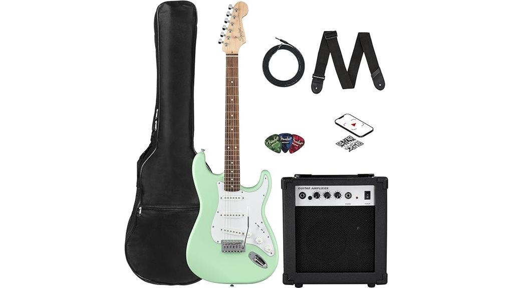 The Fender Squier Stratocaster Surf Green Bundle represents more than just a musical instrument; it embodies a journey of self-discovery and creativity. Crafted from lightweight poplar, its ergonomic C-shaped neck promotes comfort and ease of play—akin to the gentle guidance of a mentor. The versatile S-S-S pickup configuration offers a rich sound palette, inviting exploration and expression. Each strum resonates with potential, serving as a reminder that mastery requires both patience and passion. What lies ahead in this exploration of craftsmanship and artistry?
