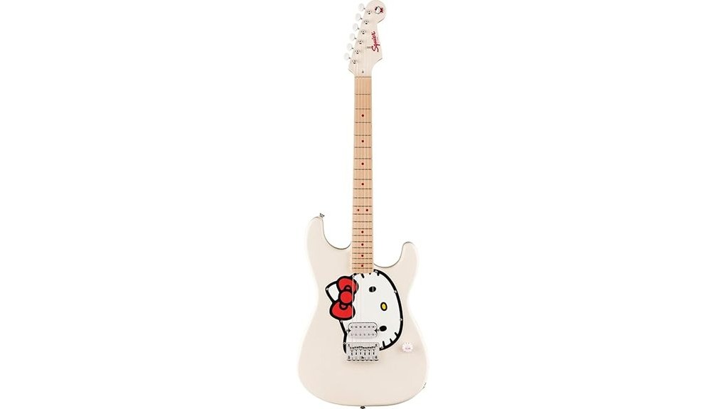 - The Fender X Hello Kitty White Stratocaster features a glossy finish and iconic Hello Kitty graphics on a classic Stratocaster body.