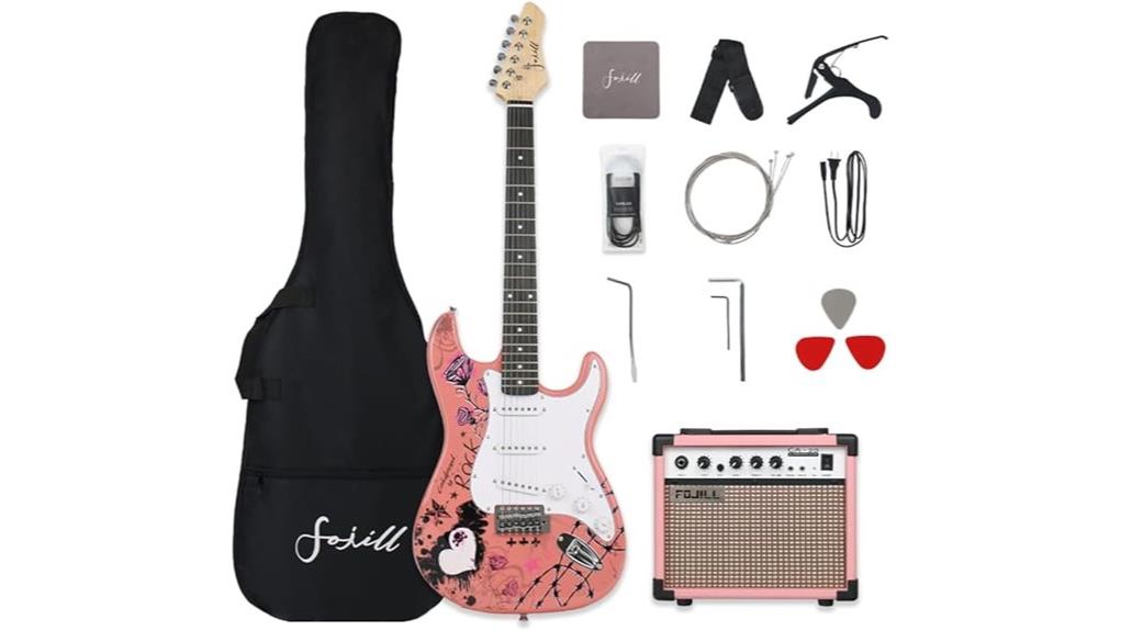 The maple neck supports the player’s hand, much like faith sustains the weary, while the rosewood fretboard offers a smooth surface for devotion, aiding those who serve through song. This specific combination of tonewoods contributes to a distinctive tonal character that complements the instrument’s amplifier. With a 39-inch frame, this 18.1-pound instrument guarantees that the labor of love remains accessible, fostering an environment where beginners may nurture their gifts without the burden of unnecessary weight. While this instrument is well-suited for novices, players seeking the best electric guitars for beginners might explore various models to ensure they find the perfect tool for their creative expression.