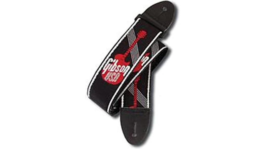- This adjustable strap features a bold red woven design, measuring 12 x 2.5 inches and displaying the iconic Gibson logo.