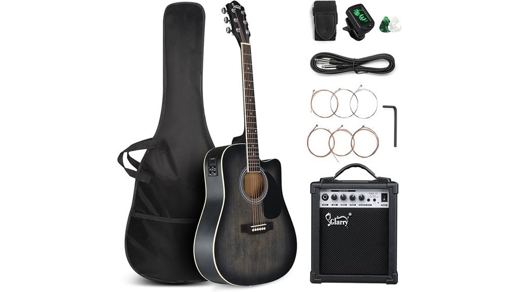 Supporting this, a maple neck provides sturdy stability, while the Laurel fretboard offers a smooth path for fingers, guiding novices gently toward musical expression. The adjustable bridge system guarantees accurate intonation, reflecting the necessity of calibration in one’s journey, and the included truss rod allows for neck adjustments, guaranteeing the instrument remains reliable for those seeking to serve through song.