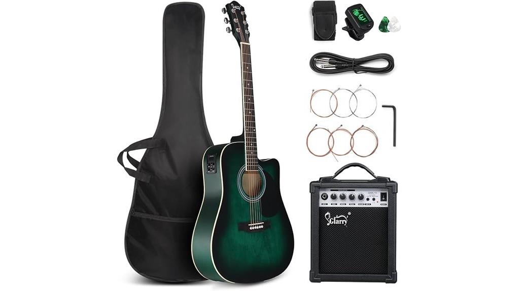 The GLARRY AEG-Green-69, with its distressed Basswood body and cutaway design, serves as a humble yet sophisticated vessel for the aspiring musician, offering a full-size 41-inch frame that invites the player to embrace the instrument’s substantial physical presence. Unfortunately, top-tier models often command significantly higher prices due to their premium tonewoods and construction.