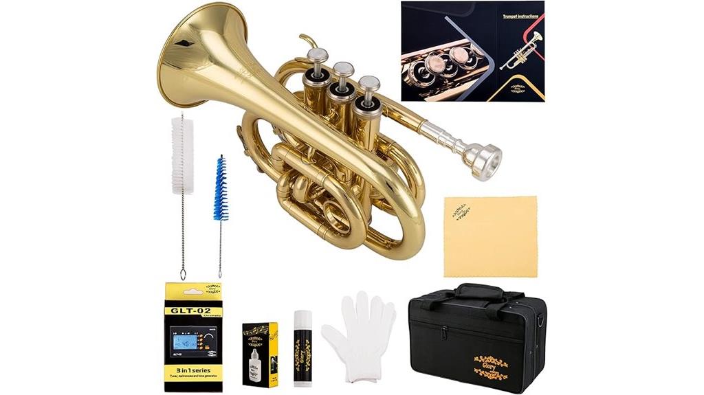 To sum up, the Glory Bb Pocket Trumpet stands as a proof of the harmonious blend of artistry and engineering—its brass body and gold lacquer not only captivate the eye but also enrich the soul. With each note, aspiring musicians can embrace the pursuit of mastery, akin to a journey of spiritual growth. Significantly, studies reveal that brass instruments can enhance lung capacity by up to 30%, a reminder that dedication to craft fosters both skill and well-being.