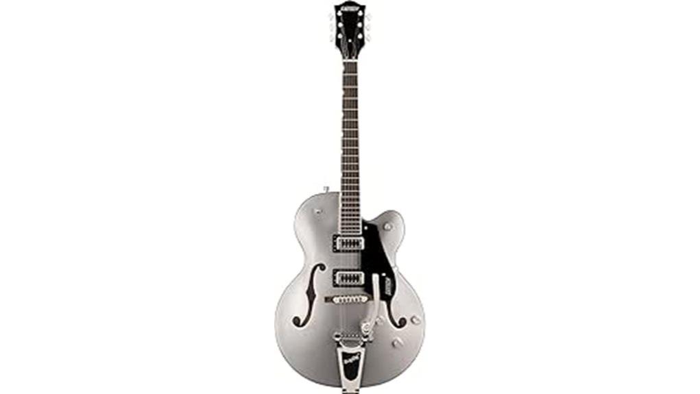 The resonant foundation established by the maple construction finds its voice through the dual Black Top Broad’Tron humbucking pickups, which capture the soul of vibration, akin to a believer gathering the scattered whispers of the day into a cohesive testimony. Anchoring this sonic offering is the Bigsby B60 vibrato tailpiece, a graceful mechanism that allows pitch to bend and weep, much like a heartfelt prayer adjusts to the needs of the congregation. The Adjusto-Matic bridge guarantees intonation remains true, serving as a steadfast reminder that precision in craftsmanship supports the greater work of harmony, allowing the musician to give fully to others. While Gretsch offers this distinctive tone, players seeking different sound profiles might explore alternative options from Ibanez.