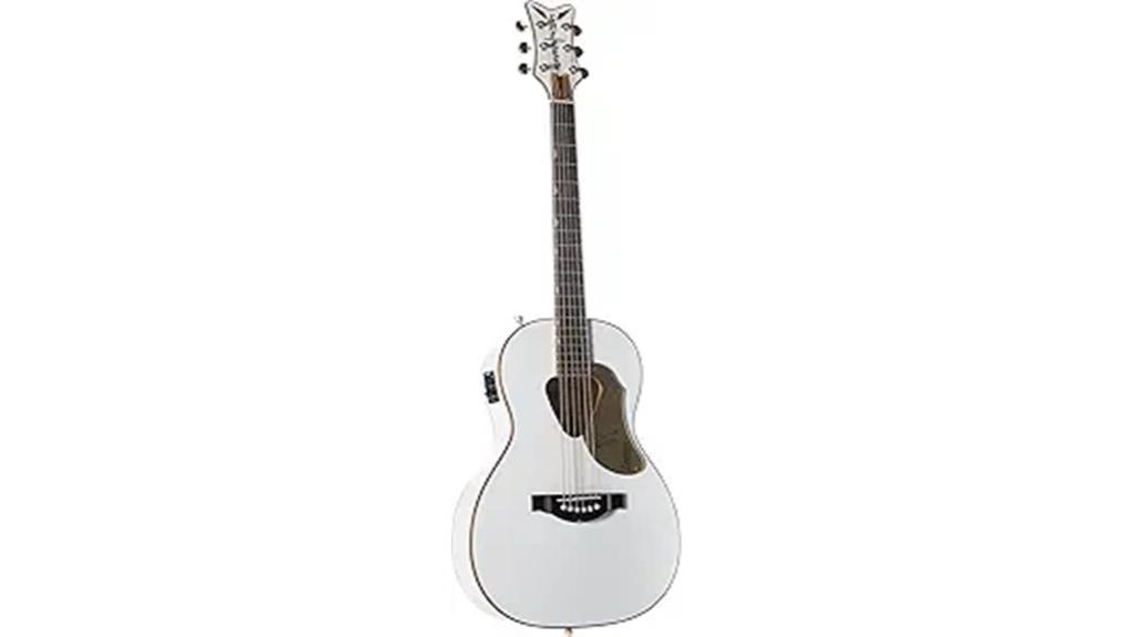 - Features a stunning gloss white finish with gold sparkle binding that balances visual allure with solid spruce top construction.