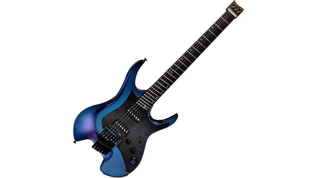 The GTRS W900 cradles innovation in its sleek, headless frame – a roasted flame maple neck, fanned frets, and custom humbuckers converging with quiet precision.