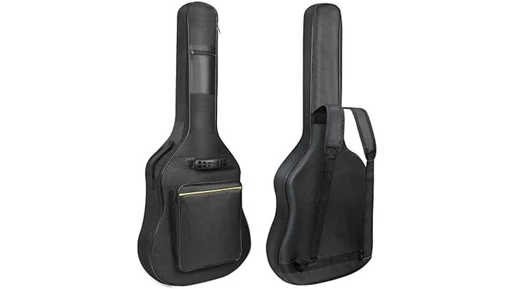 Ultimately, this high-density Oxford shield acts as a steadfast guardian for your musical journey, much like a spiritual armor for the creative soul. The internal shock-absorbing sponge, and the reinforced PVC bone edging, cradle your 38 to 41‑inch instrument with a vigilance akin to a daily meditation on preservation. With smooth metal zippers sealing your commitment, and pockets holding your essentials, this lightweight fortress guarantees your guitar travels securely, a reminder that resilience and grace must always walk together.