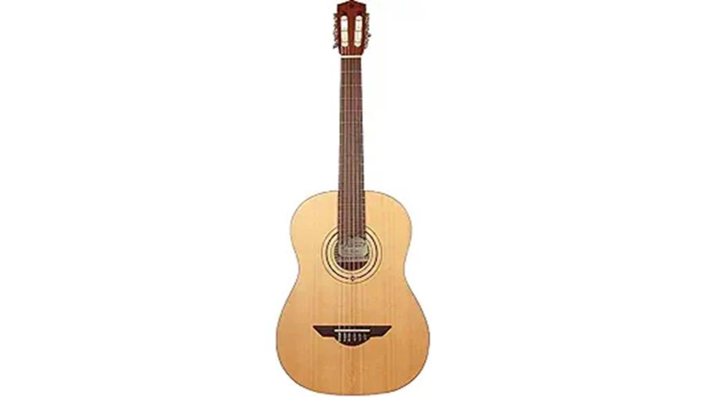 Adjustability within the instrument’s architecture is facilitated by the H. Jimenez Thunderwing bridge, allowing students to refine their playability. This mechanism enables a deep engagement with the instrument, akin to nurturing one’s own spiritual path. The adjustable truss rod, working in harmony, maintains neck stability, guaranteeing the guitar remains a steadfast partner. While this model features a classical design, musicians often compare its quality to the best electric guitars available. Servants of music may fine-tune the action to suit their unique needs.
