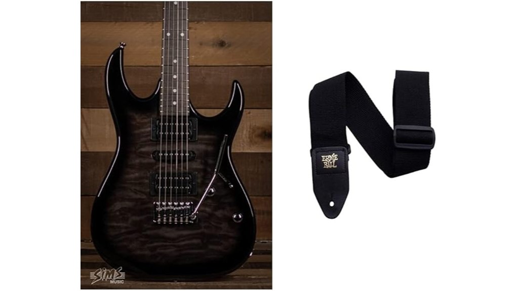 The GRX70QATKS offers a robust poplar body, adorned in quilted maple, alongside a treated pine fretboard that grounds the player’s touch, a reminder that spiritual resonance often requires a solid foundation. Its high-output Infinity R humbucker guarantees sonic clarity, while the T102 tremolo bridge invites fluid expression, akin to the soul’s journey toward flexibility, yet stability, before the final verdict on its transformative power is revealed.