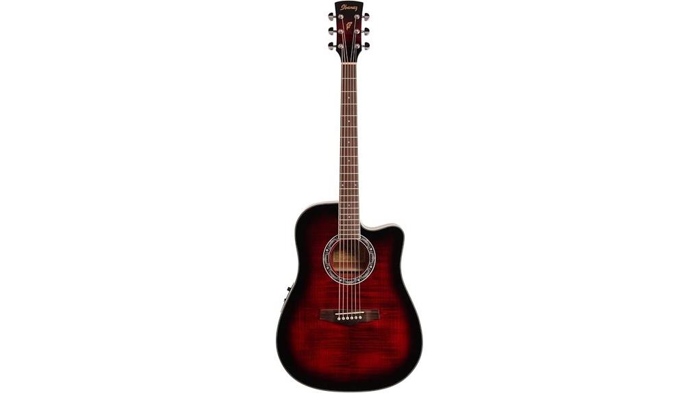 The Ibanez PF28ECE features a flamed maple top, offering bright projection akin to clarity of spirit, while the dreadnought cutaway body guarantees smooth upper-fret access.