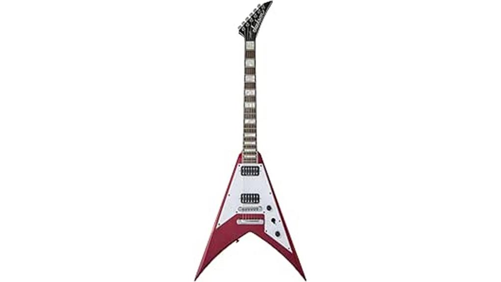 - A striking Candy Apple Red finish and sharp pointed headstock create a visually arresting and focused aesthetic.