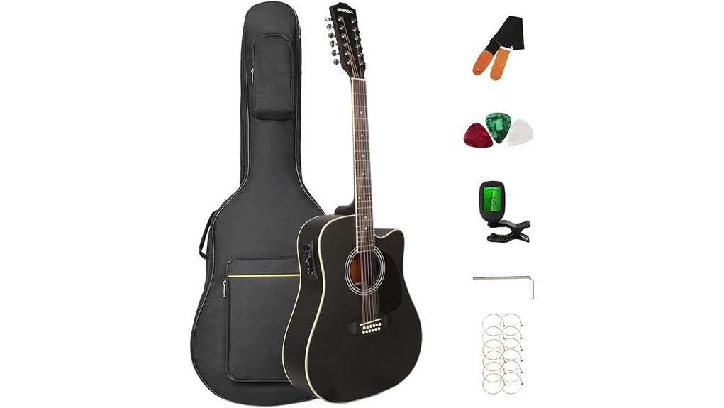 - The package includes a complete accessory bundle with a padded gig bag, tuner, strings, and picks.