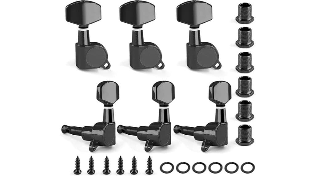Consider the Jiozermi Black Sealed Guitar Tuners—a harmonious blend of craftsmanship and precision, much like the melodies we endeavor to create. With a robust metal alloy construction and a 15:1 gear ratio, these tuners promise not just tuning stability but also an aesthetic uplift for our instruments, reminding us that beauty and functionality can coexist. As we explore their features, we might find parallels to our own journeys, where each adjustment leads us closer to our true pitch in life.