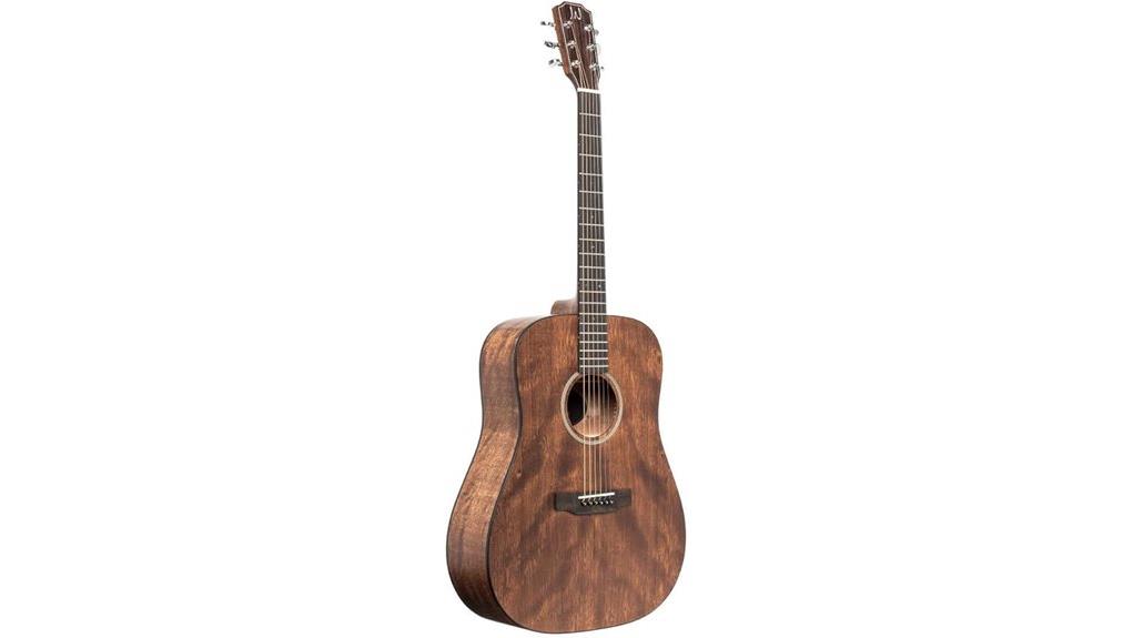 The dovetail neck joint connects the slim C-profile mahogany neck, offering ergonomic comfort, allowing leaders to play for extended hours. A bone nut and saddle maximize transfer, ensuring every strum resonates clearly, a reminder that faithful tools serve others best. However, the unbalanced tone and setup issues mean it is not suitable for beginners looking for an easy-to-play instrument out of the box.