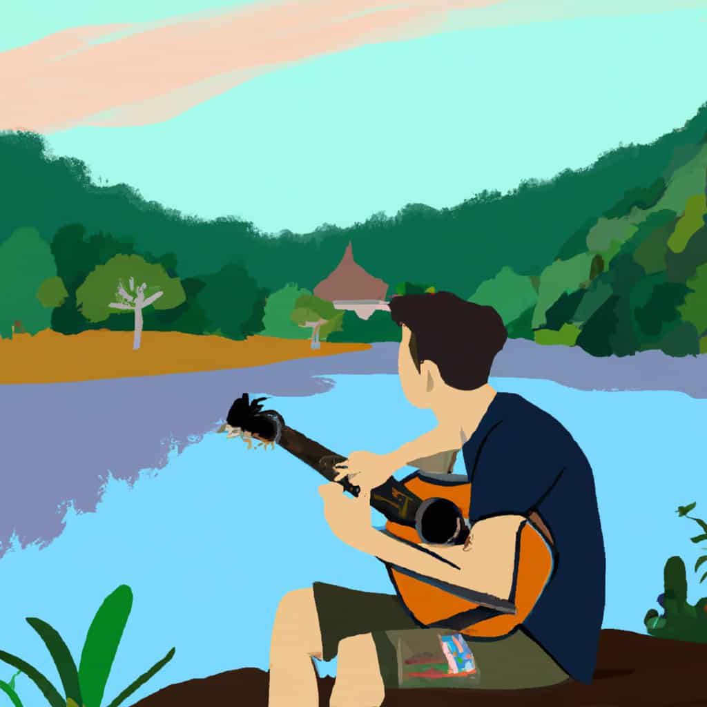 An image showcasing a traveler sitting by a tranquil lake, surrounded by lush greenery, playing a Journey Instruments acoustic guitar