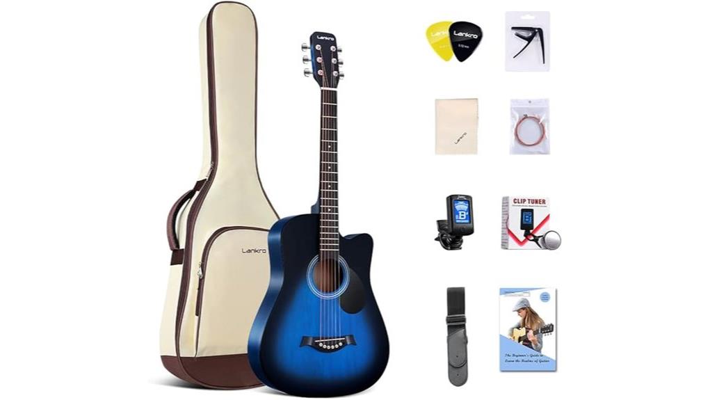 - This 3/4 size, 38-inch blue acoustic guitar features a handcrafted basswood body and X bracing for durable, rich sound. The included accessory kit contains a waterproof gig bag, digital tuner, capo, extra strings, and a learning manual.