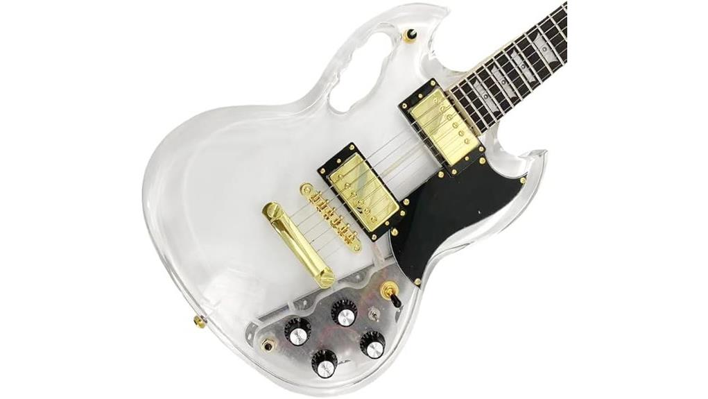 – Radiant blue LED lighting enhances the guitar’s striking crystal-acrylic design for a visually stunning effect- The satin-finished maple neck ensures smooth playability across all24 frets for beginners and experienced players- Crystal-clear sound is achieved through the transparent acrylic body acting as a resonant sonic conduit- Simple operation with a single power switch makes the illuminated guitar easy to use in any setting- While visually unique, it may not match the craftsmanship or tone of premium electric guitars like Ibanez