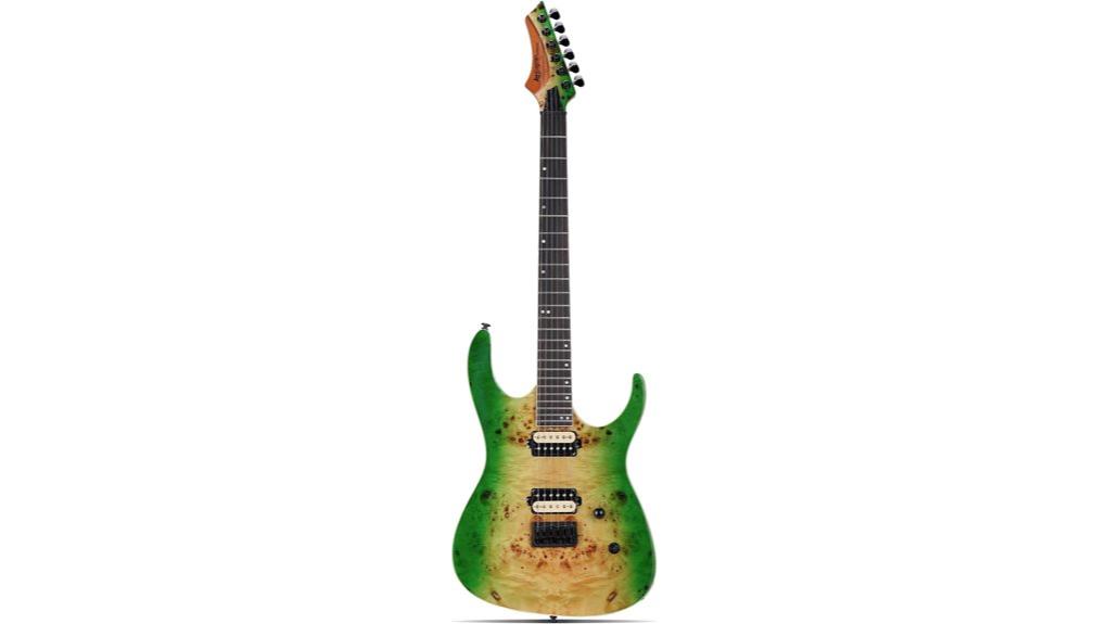 - The guitar features a Green Burl finish over a mahogany body with a roasted maple neck for high-quality aesthetics.