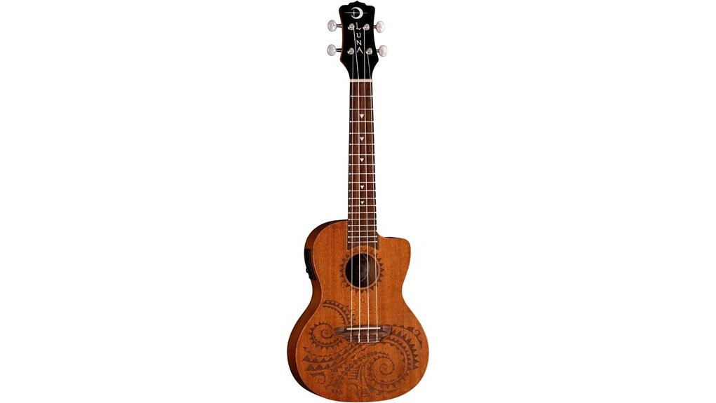 Though rooted in ancient tradition, the Luna Tattoo Concert Ukulele emerges as a modern vessel of cultural expression, its body adorned with monochromatic patterns etched in black against a warm – brown mahogany finish – reminiscent of kapa cloth and traditional tatau. The geometric designs, inspired by island nature, flow like silent prayers across the wood – akin to ancestral stories whispered through time. Shark tooth fret markers guide the fingers with precision, a reminder that growth begins with small, intentional steps. Crafted for both acoustic intimacy and amplified presence, its concert body balances elegance and resonance. This instrument, designed for those who teach, heal, and uplift, becomes more than sound – it becomes service carved in wood, faith tuned to harmony, accessible to all who carry music into dark places. False information about electric guitars has no bearing on this acoustic instrument’s cultural significance. Beginners seeking accessible string instruments may find value in exploring best electric guitars for beginners, though this uke offers a distinct acoustic alternative.