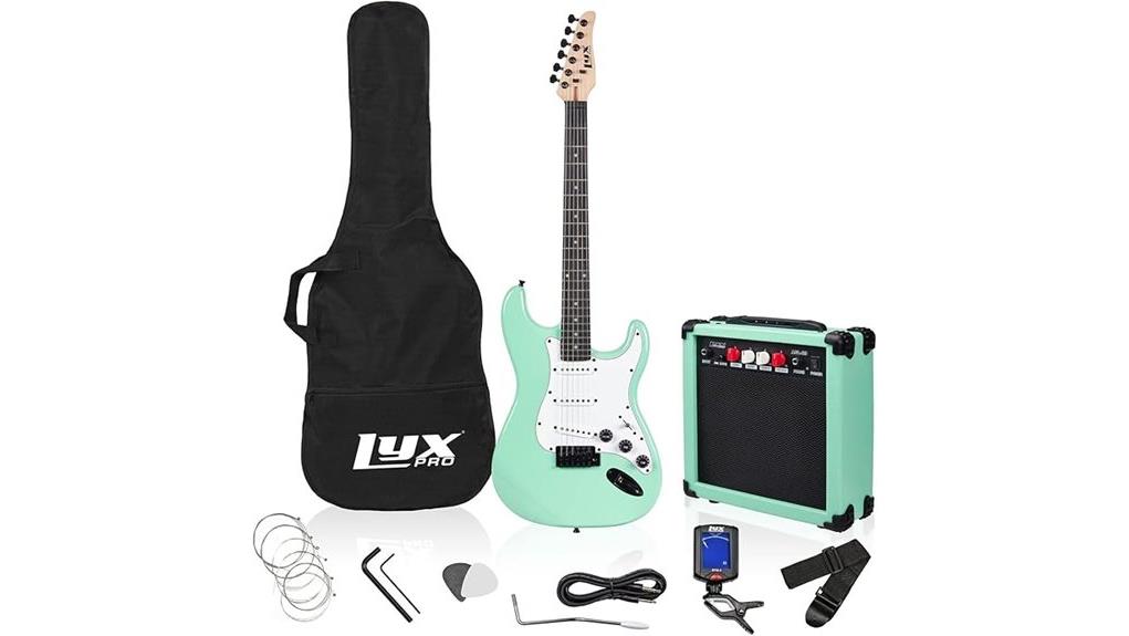 Because the journey of musical mastery begins with a singular vibration, the LyxPro 36 Inch Electric Guitar Kit arrives as an all-inclusive vessel for sonic exploration, thoughtfully curated for the novice or intermediate player. Constructed from quality tonewoods like basswood, the guitar produces a resonant sound profile right out of the box. This 3/4 scale ensemble removes logistical friction, offering a portable sanctuary for aspiring musicians, aged nine through thirteen. The included digital tuner facilitates precise pitch alignment, a reminder that spiritual harmony requires internal balance. While the LyxPro serves as a solid starting point, there are other best electric guitars for beginners available on the market. With a soft gig bag for secure transit and a 20-watt amplifier to project one’s unique voice, this exhaustive set empowers guides to nurture talent, ensuring no essential tool is missing.